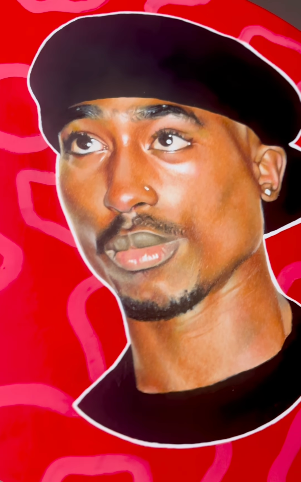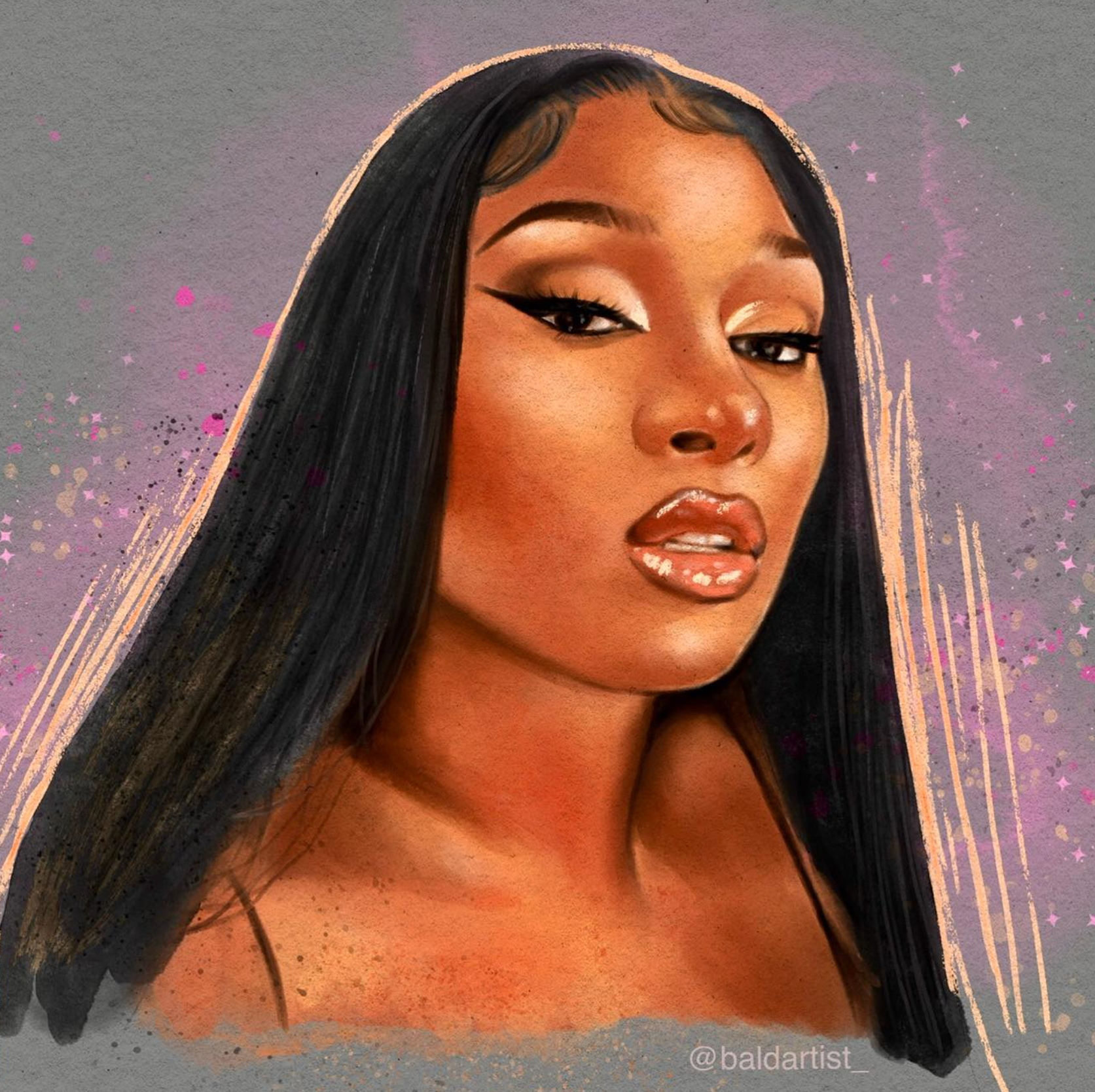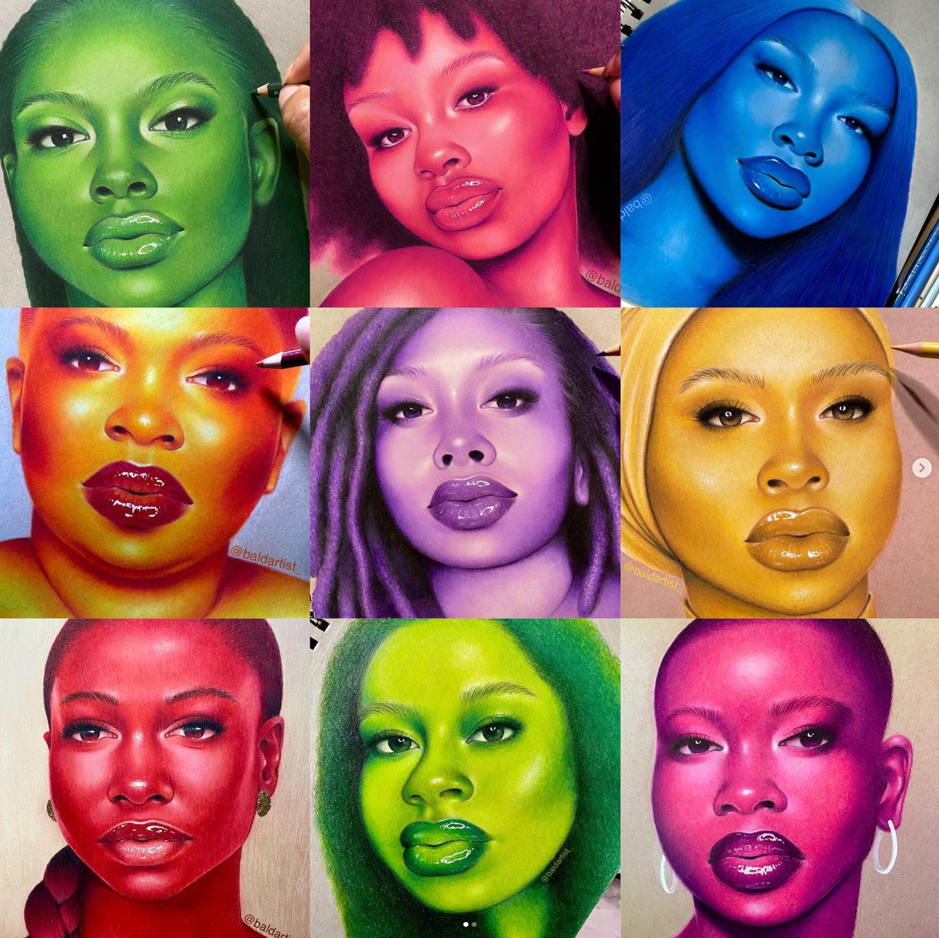 Derin Fletcher, also known as the Bald Artist, inspires me because of her bold visual style and strong use of color. Her work feels striking and direct with compositions that immediately grab attention. What I admire most is how her pieces feel confident and expressive rather than overly polished. Her artwork has personality and presence as she uses color theory, shapes, objects, and patterns to represent different cultures and communities. Whether it’s a celebrity or a fictional portrait, each person she illustrates has a story.